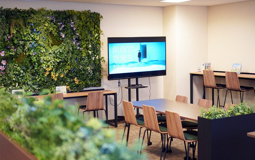 正面には巨大スクリーンが設置され工場見学会や大規模社内セミナー等の会場として使用しています。